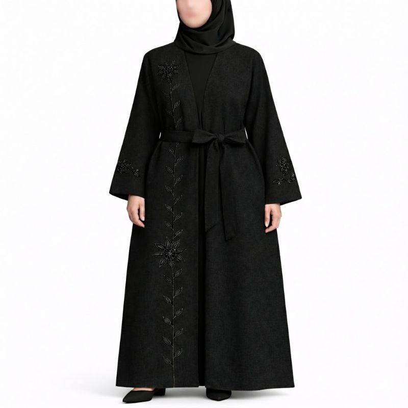 Elegant 4-piece abaya set featuring a breathable cotton outer, smooth CY inner, matching scarf, and belt. Designed with delicate embroidery and a graceful silhouette, this outfit offers comfort, modesty, and timeless elegance for everyday and special wear.