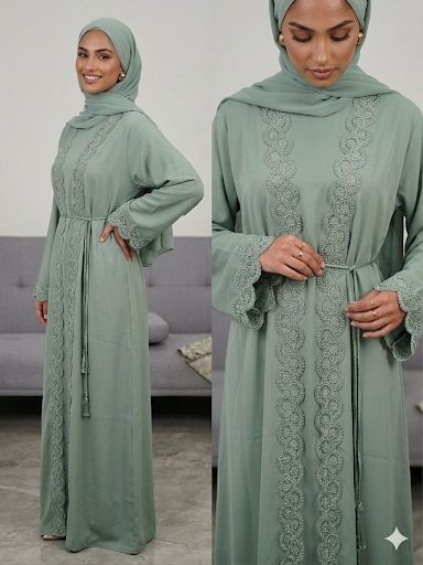This premium 4-piece Nida Abaya set includes an embellished outer abaya, a matching inner dress, a coordinated hijab, and a belt. Crafted from high-quality Nida fabric, it is the perfect choice for parties, weddings, and Eid celebrations, offering a blend of luxury and modesty.