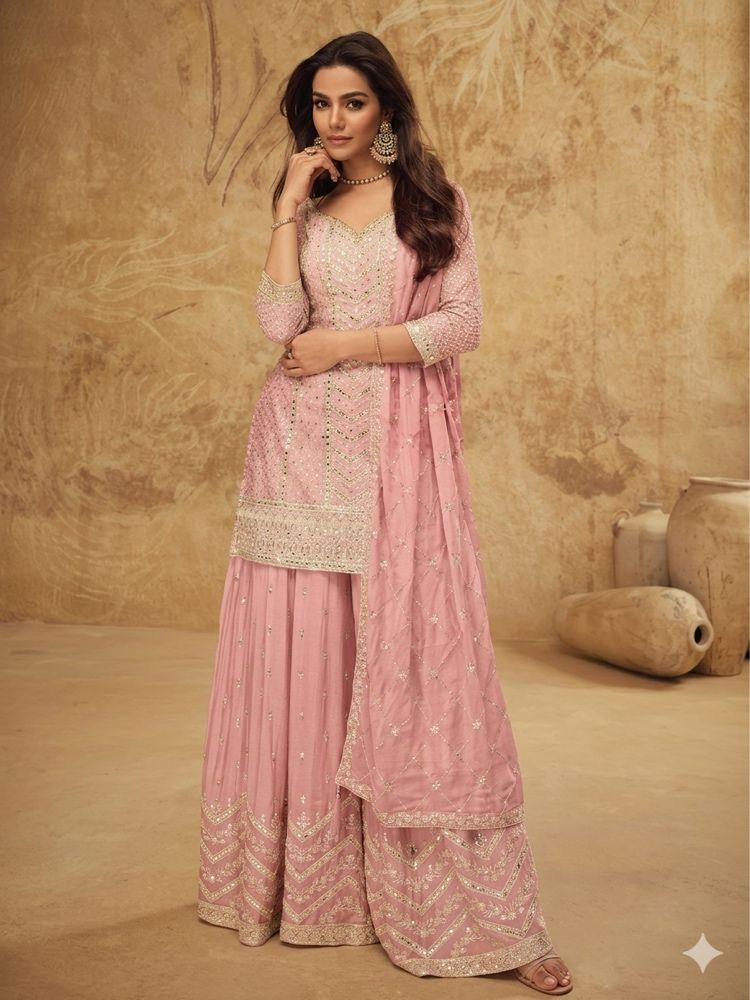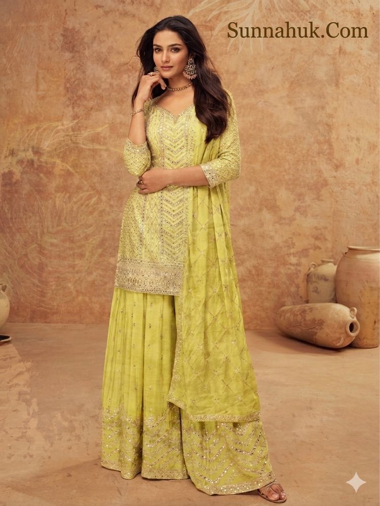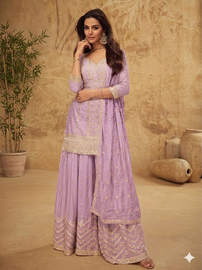 Elevate your celebrations with this premium three-piece set crafted from high-quality Chinon fabric. Featuring intricate golden zari work and shimmering sequins on a short kurti and voluminous wide-leg trousers, this outfit comes paired with a gorgeous, lightweight scarf for a complete, regal look.