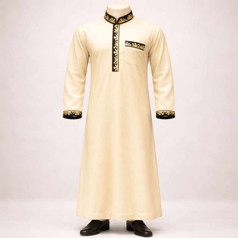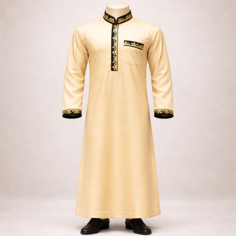 Experience luxury with our soft silk fabric thobe, designed for a smooth finish and all-day comfort. Featuring refined black & gold detailing, this thobe delivers a clean, modern, and premium look.