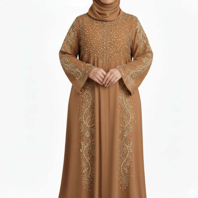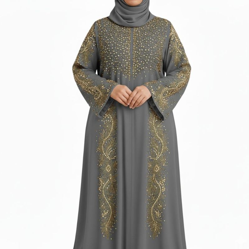 Embellishment: The abaya is heavily and intricately embellished with golden-toned stones, crystals, or beads.