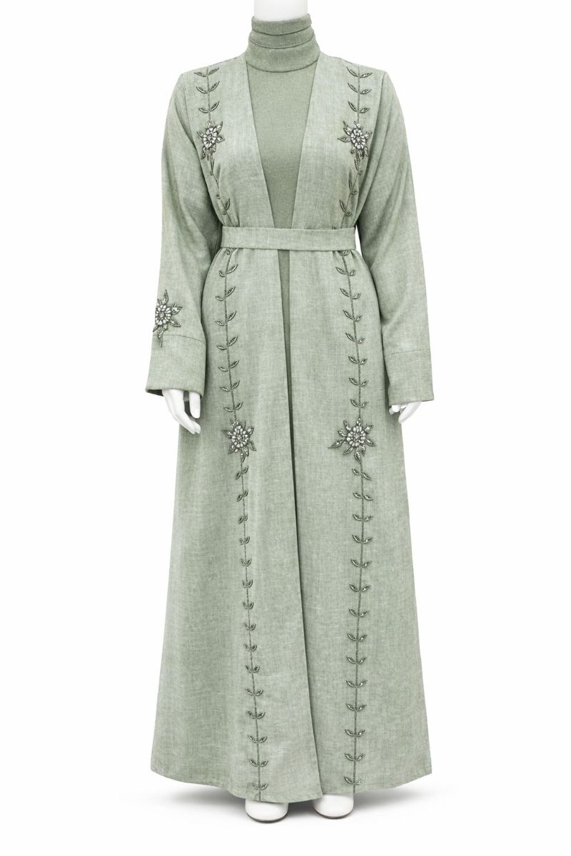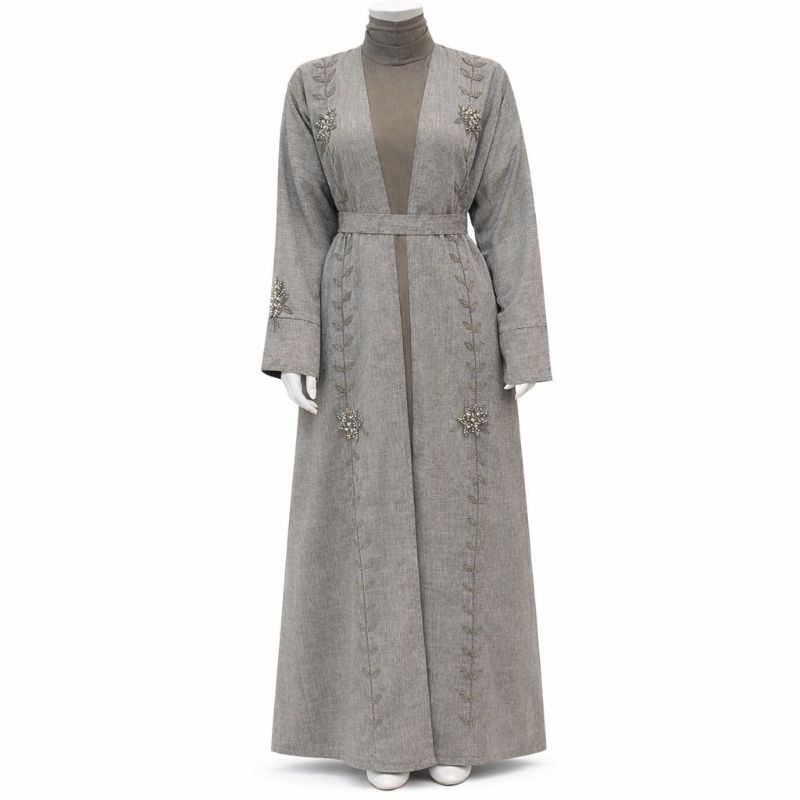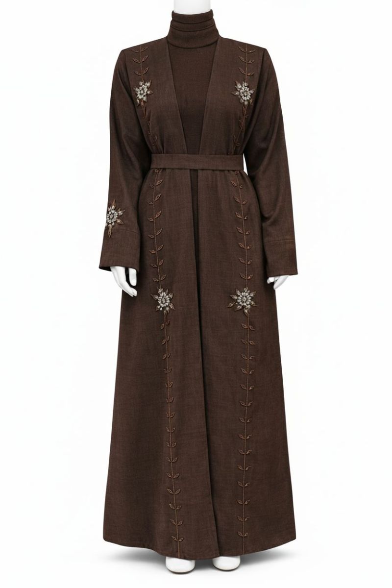 Elegant full-length open abaya crafted from premium cotton fabric, featuring delicate vine embroidery with subtle bead detailing. Comes with a matching inner and waist belt for a graceful, modest look. Available in Sage Green, Classic Grey, and Dark Brown — perfect for everyday wear or special occasions.