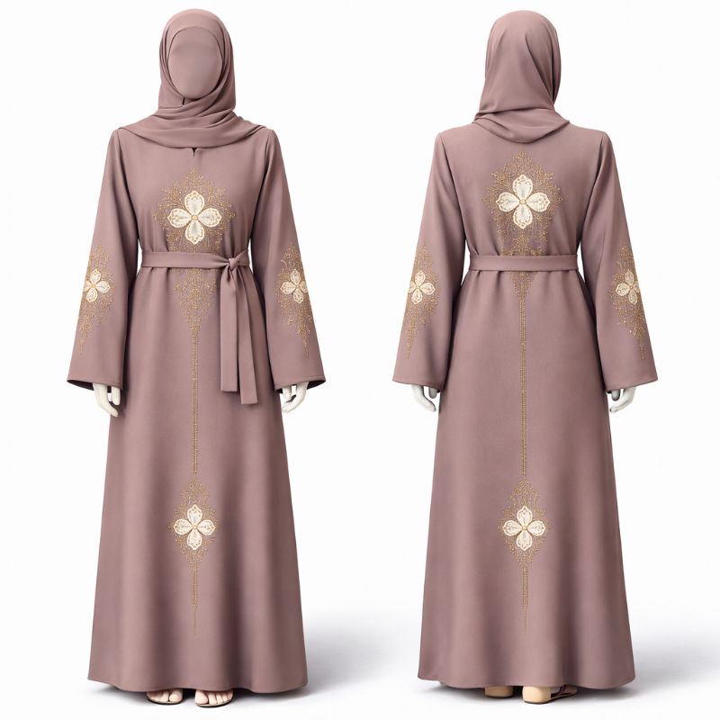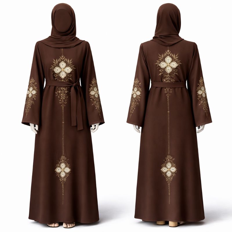 A premium single abaya crafted from soft Nidha fabric, featuring elegant embroidery on both front and back for a refined, modest look