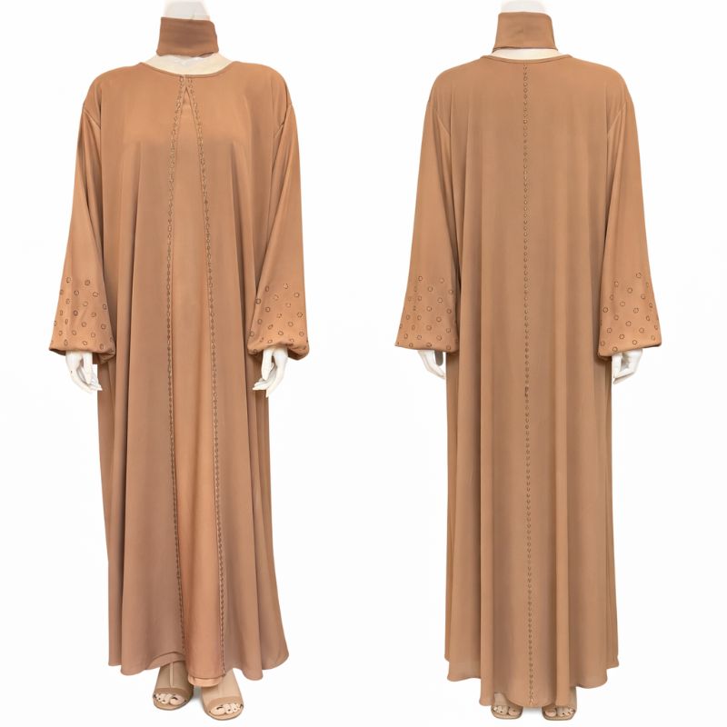 This abaya is thoughtfully crafted using a dual-layer fabric design to ensure both comfort and elegance.