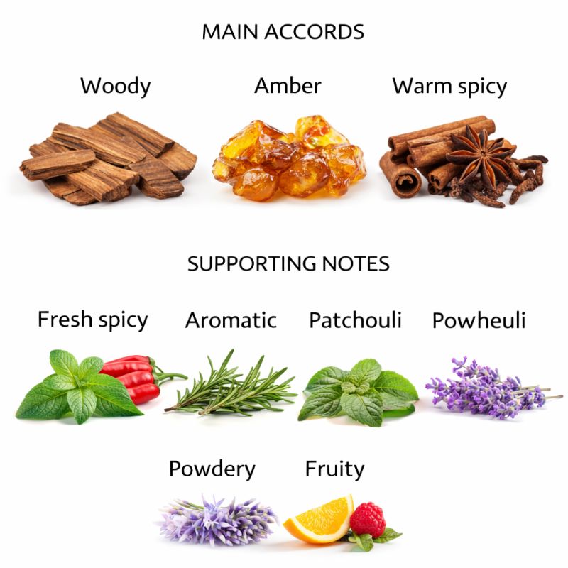 Main Accords: Woody, Amber, Warm Spicy